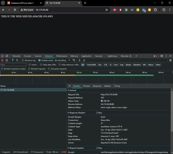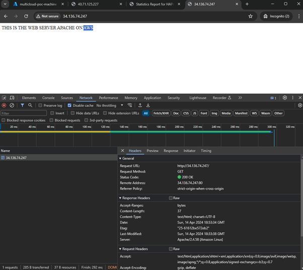 Maintenant, nous voyons une demande du navigateur au répartiteur de charge HAProxy, avec Apache AWS renvoyant le code d'état "200 OK" :