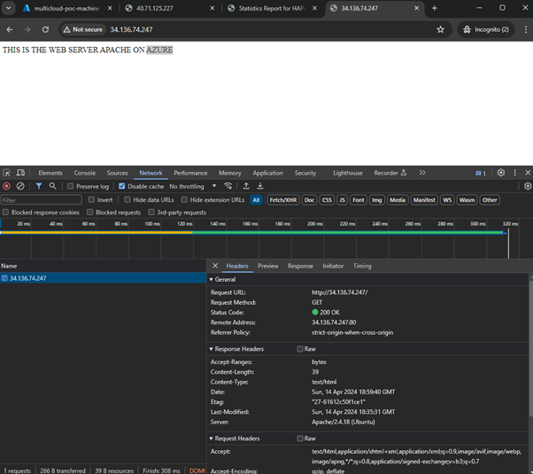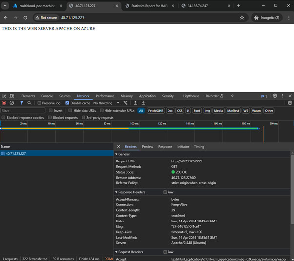 Et maintenant une demande du navigateur au répartiteur de charge HAProxy, avec Apache Azure renvoyant le code d'état "200 OK" :